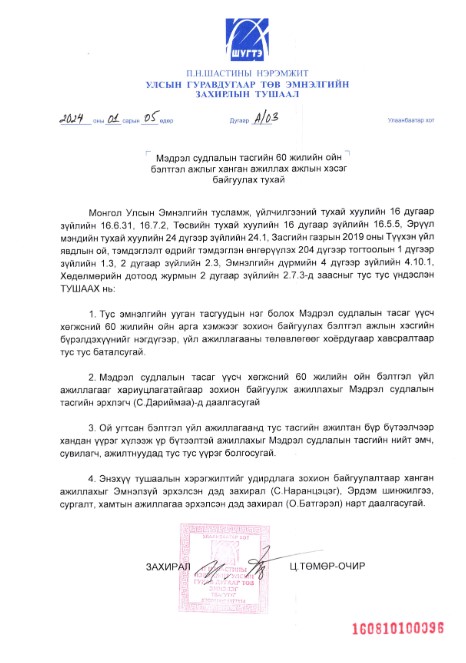 А-03 Мэдрэл судлалын тасгийн 60 жилийн ойн бэлтгэл ажлыг ханган ажиллах ажлын хэсэг байгуулах тухай