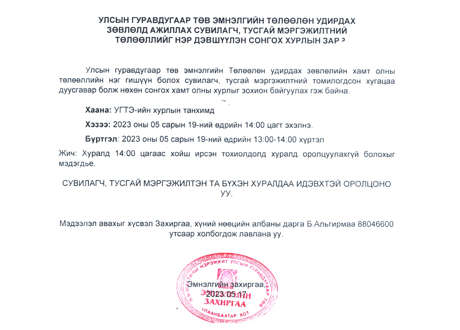Улсын гуравдугаар төв эмнэлгийн Төлөөлөн удирдах зөвлөлийн бүрэлдэхүүнд ажиллах олон нийтийн төлөөллийн сонгон шалгаруулалтын зар