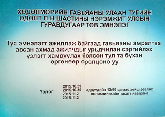 Эмнэлгийн даргын 2015 оны Б/458 тоот тушаалын дагуу “Ахмадын эрүүл мэндийг дэмжих сар”-ын хүрээнд 10-р сарын 29, 30 болон 11-р сарын 2,3-ны өдрүүдэд тус эмнэлгийн ахмад настнуудын эрүүл мэндийн урьдчилан сэргийлэх үзлэг, оношилгоог зохион байгуулав. Үзлэг, оношилгоонд 150 гаруй ахмад хамрагдсан бөгөөд урьдчилан сэргийлэх үзлэгийн дагуу ахмад настны эрүүл мэндийн судалгааг гаргаж, эрүүлжүүлэх ажлыг үе шаттайгаар зохион байгуулахаар төлөвлөж байна.
