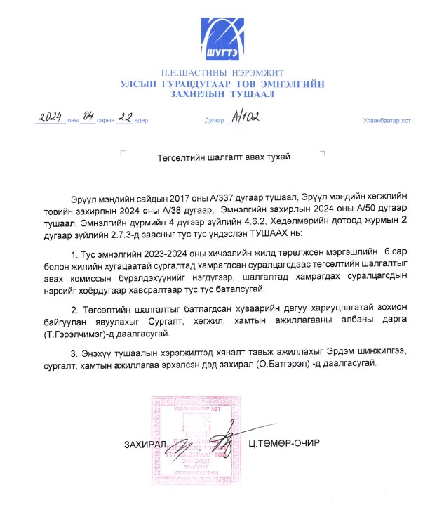 • УГТЭ-ИЙН НИЙГМИЙН ЭРҮҮЛ МЭНДИЙН АЛБАНЫ ДАРГЫН СУЛ ОРОН ТООГ НӨХӨХ СОНГОН ШАЛГАРУУЛАЛТЫН ДҮН